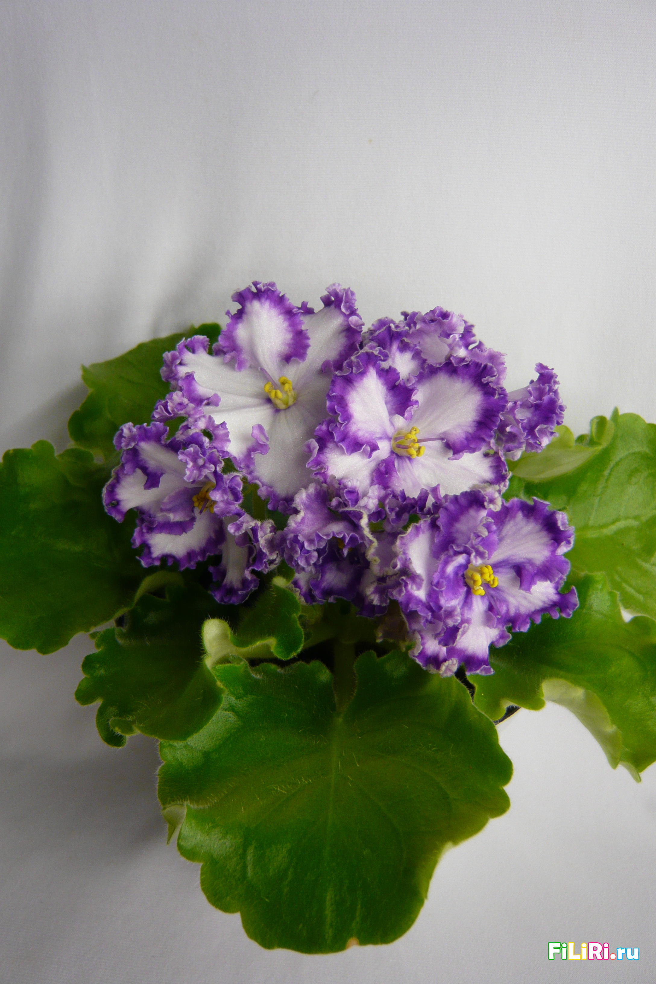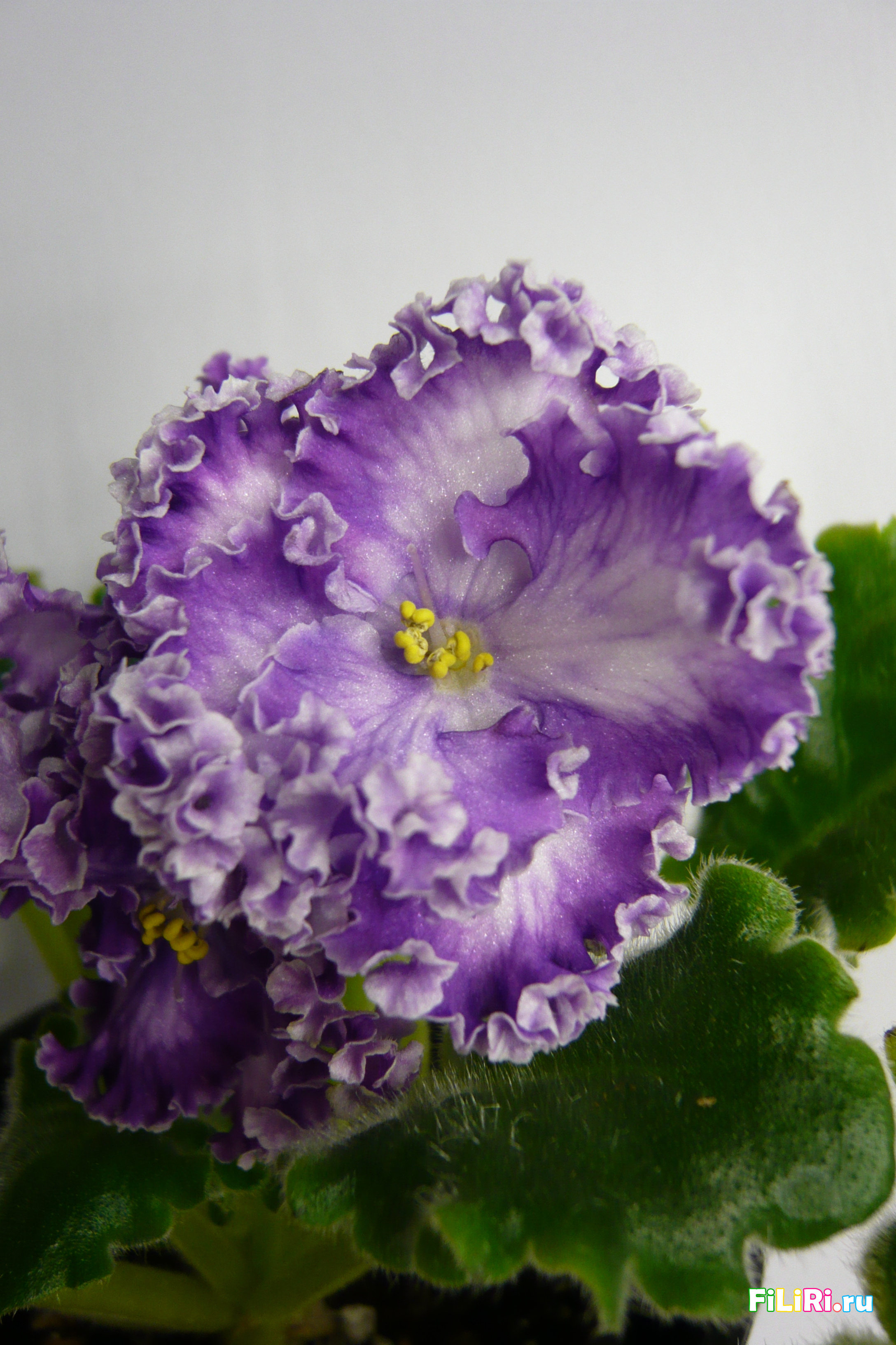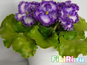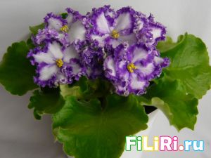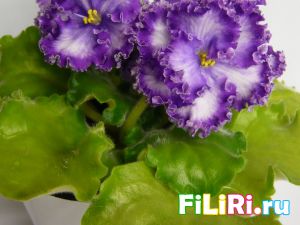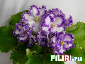 Махровые светло-сиреневые гофрированные звёзды с фиолетовой тесьмой и сетчатым фиолетовым рисунком по лепесткам. Белая карандашная кайма. Светло-зелёные волнистые стёганные листья.