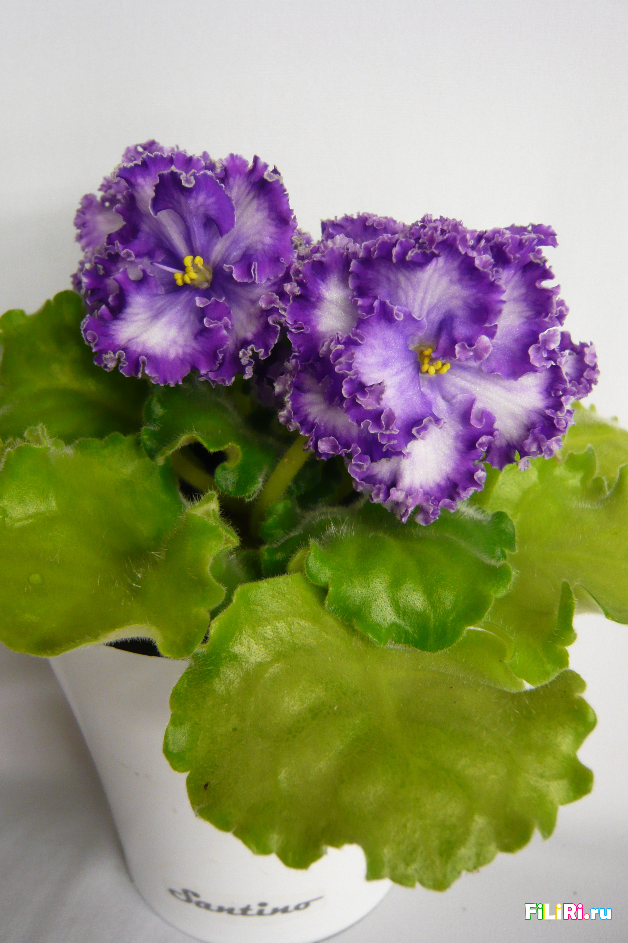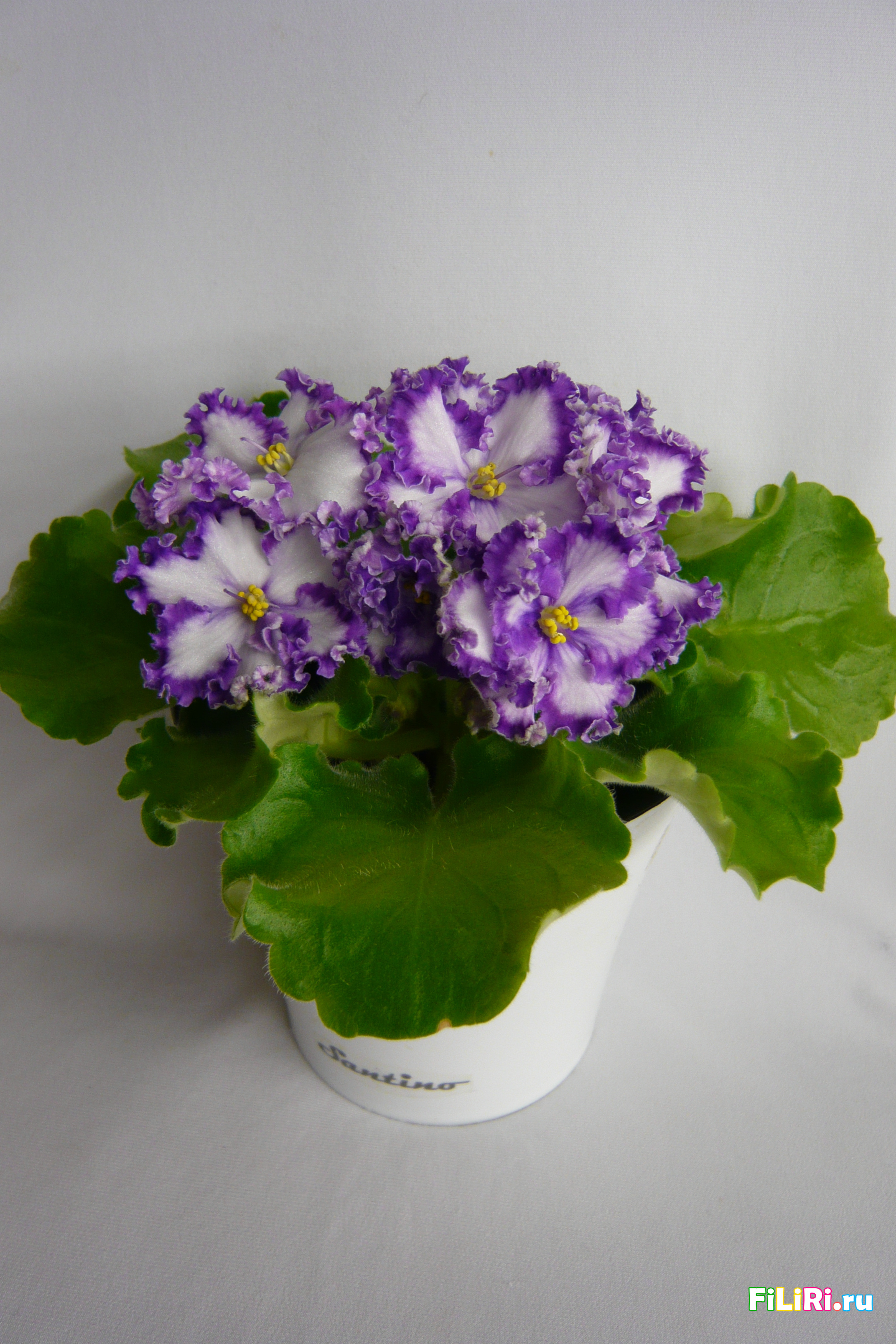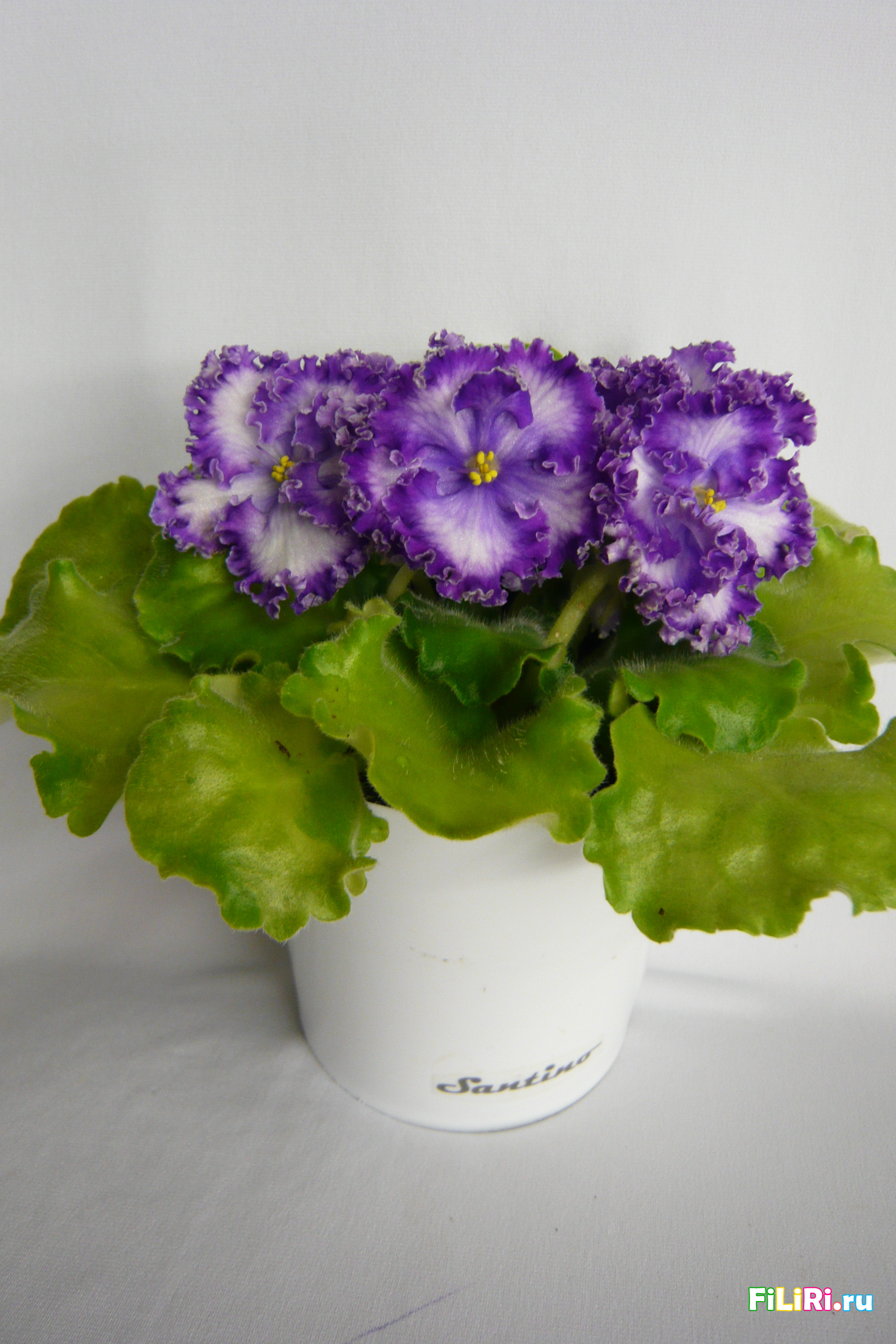 Махровые светло-сиреневые гофрированные звёзды с фиолетовой тесьмой и сетчатым фиолетовым рисунком по лепесткам. Белая карандашная кайма. Светло-зелёные волнистые стёганные листья.
